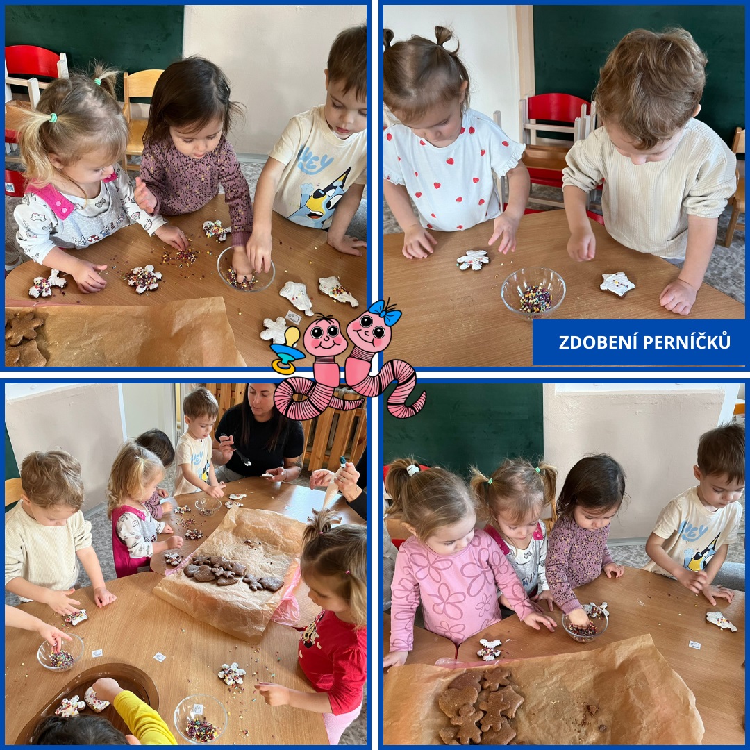 Měsíc prosinec se nesl v duchu adventní atmosféry, vánočních tradic a společných zážitků. Průběžně jsme si s dětmi povídali o Vánocích, jejich významu a tradicích, zpívali jsme vánoční koledy a společně se naladili na sváteční čas. Děti se zapojily do pečení a zdobení perníčků, pomáhaly se zdobením vánočního stromečku a s nadšením se podílely na natáčení vánočního videa.